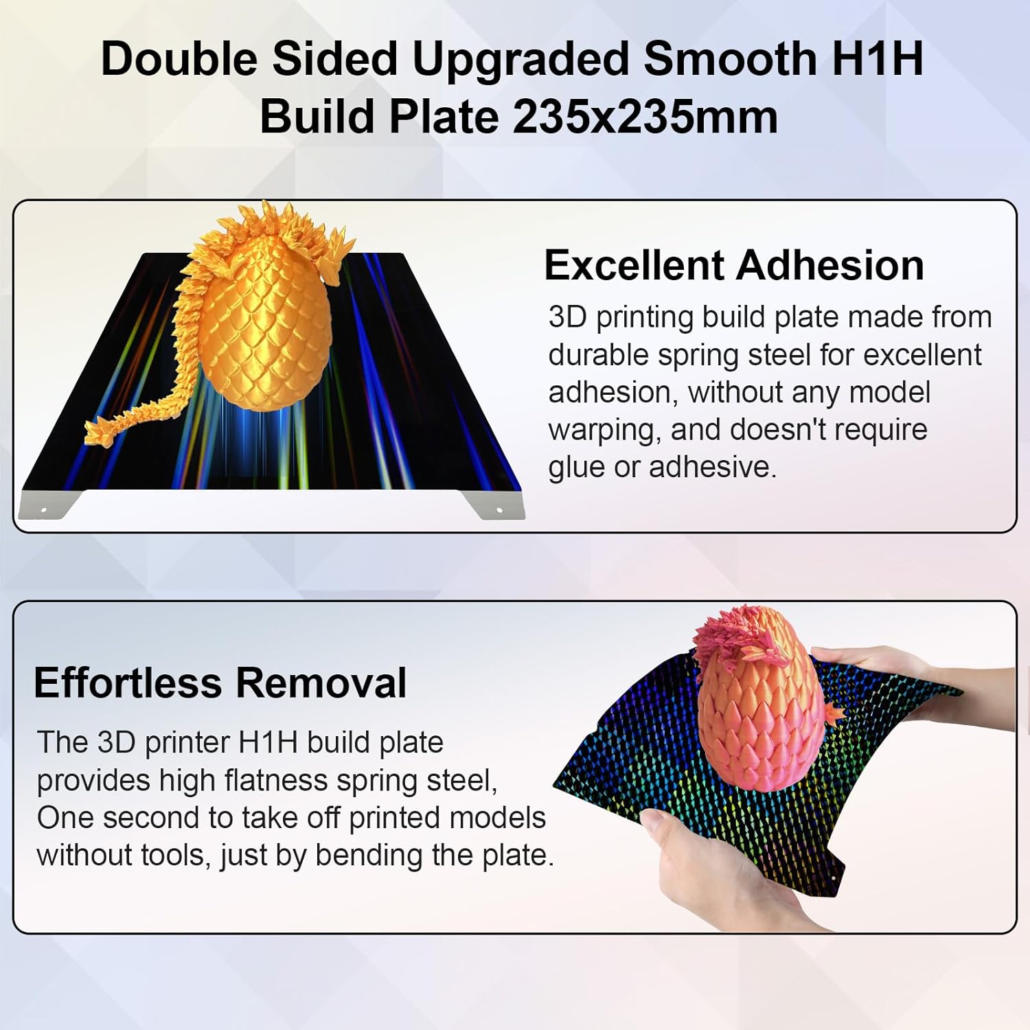 H1H 光滑构建板适用于 Creality K1C/K1/SE/Ender 3 V3 SE/Ender 3 V3 KE/Ender 3 S1/Pro/Ender 5 S1,柔性双面光束+幻影 H1H 效果板无磁性板 235x235mm
