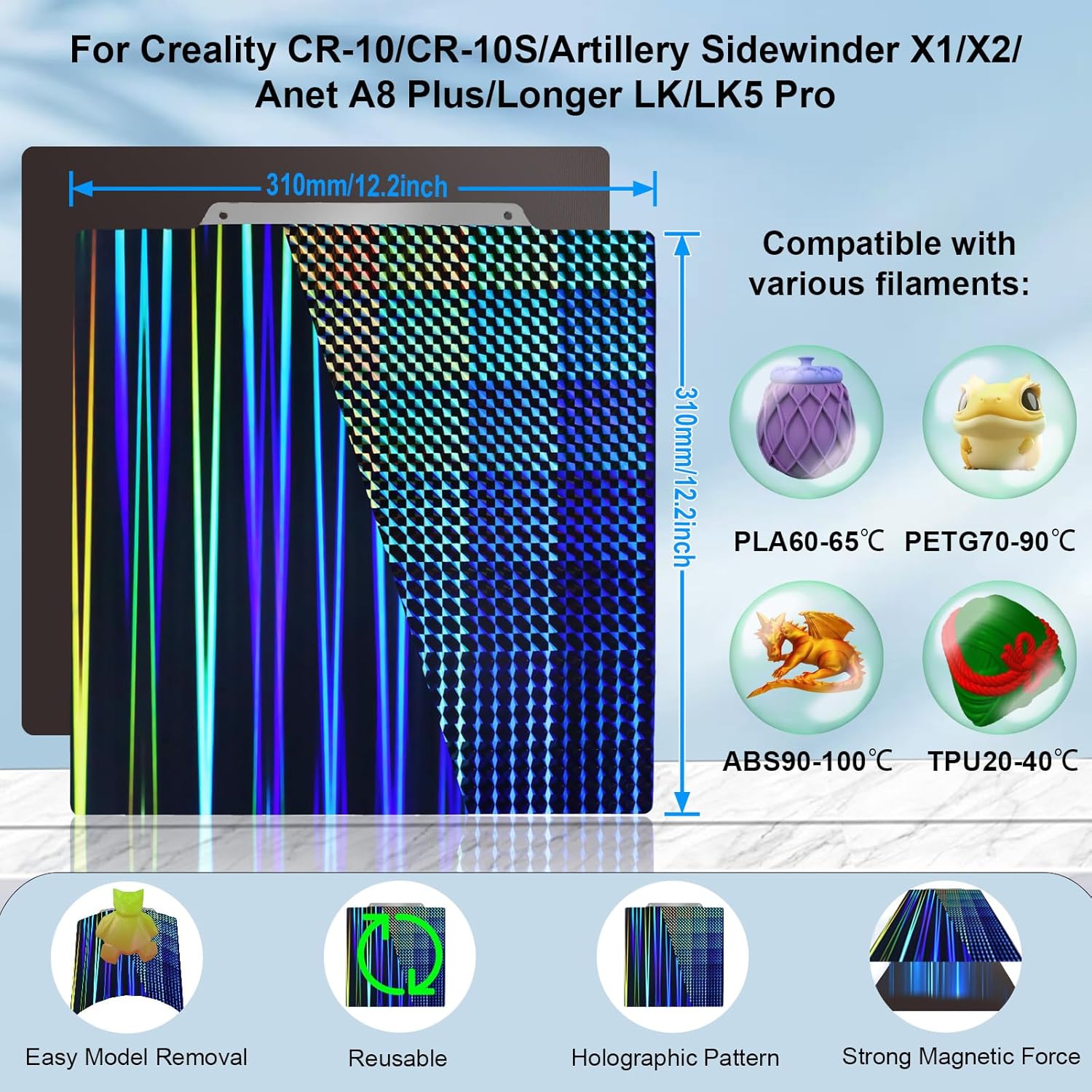 H1H 弹簧钢板带磁性构建板,适用于 Artillery Sidewinder X1/X2,适用于 Creality CR-10/CR-10S Anet A8 Plus,适用于 QiDi Plus 4,H1H 打印床 310x310mm 3D 打印机平台
