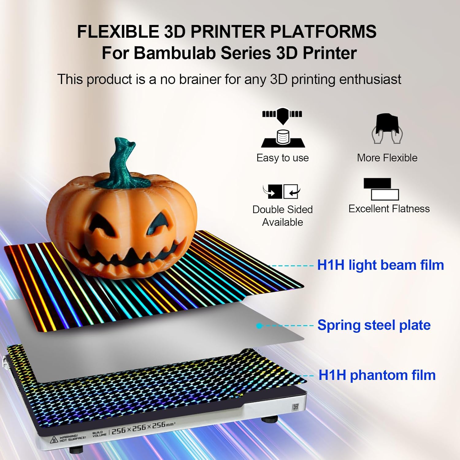 适用于 Bambu Lab A1/X1C/X1/X1E/P1S/P1P 的光滑 H1H 构建板,适用于 Bambu Labs 底板的柔性光束 + Phantom H1H 弹簧钢板 257x257mm